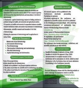 ١-توفير منصة وبيئة مناسبة للعلماء والباحثين من مختلف انحاء العالم لتبادل نتائج ابحاثهم وخبراتهم وعرض احدث التطورات والابتكارات في مجال التقنيات الاحيائية.