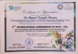 شارك التدريسي من قسم التقنيات الاحيائية النباتية،لمركز بحوث التقنيات الأحيائية،جامعة النهرين، المدرس الدكتور (احمد فليح حسن)، في المؤتمر الدولى الثاني لمدينة الابحاث العلمية و التطبيقات التكنولوجية.