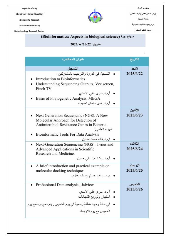 منهاج دورة(Bioinformatics: Aspects in biological science) بتاريخ 22-2025/6/26اخبار المركز / 06/05/2025 https://forms.gle/1NdQWPLhRTvnFhCz9 رابط التسجيل في دورة (Bioinformatics:Aspects in biological science)